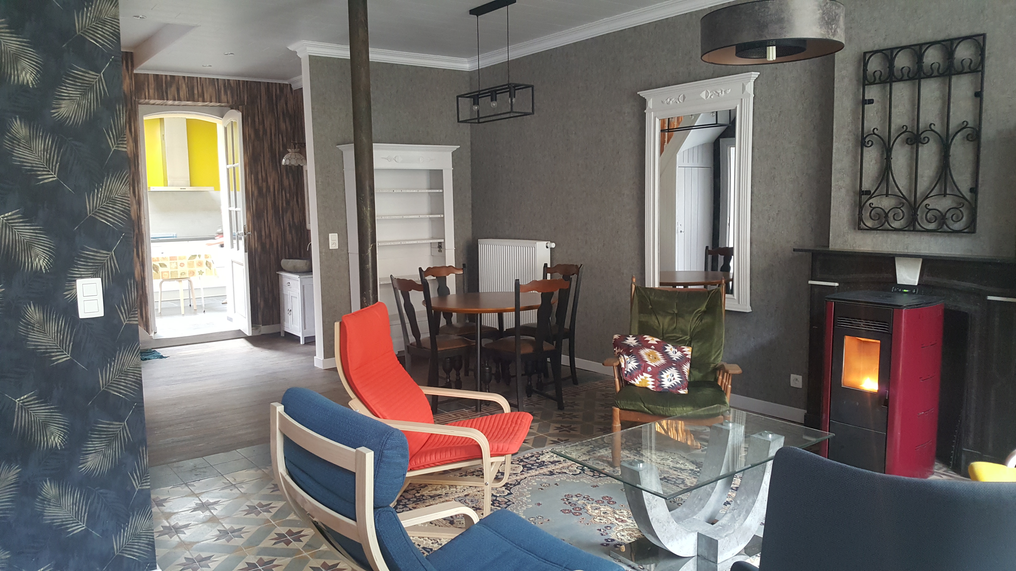 Le séjour est convivial. Il se divise entre une table de travail ou de jeu et un salon garni de fauteuils. La télévision y est installée.